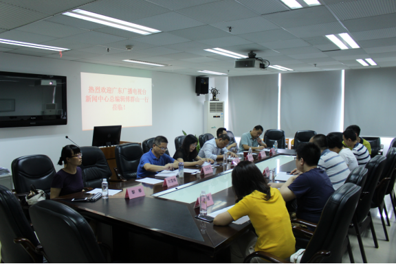 会议室开展新时代融媒体交流与合作座谈会。广东广播电视台电视91自拍总编辑傅群山、时政部总监吴琳琳、民生部副总监杨琨、时政部监制陈晨、时政部记者袁媛、91自拍