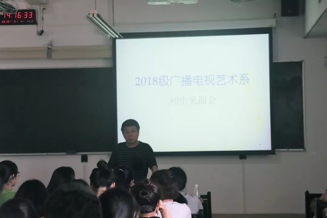 播音与主持艺术系2018级师生见面会于文新323举行,由肖思为老师主持,三个播音班到场,出席老师有张爱凤教授、刘玉萍副教授、系副主任陈智勇老师等7位老师。