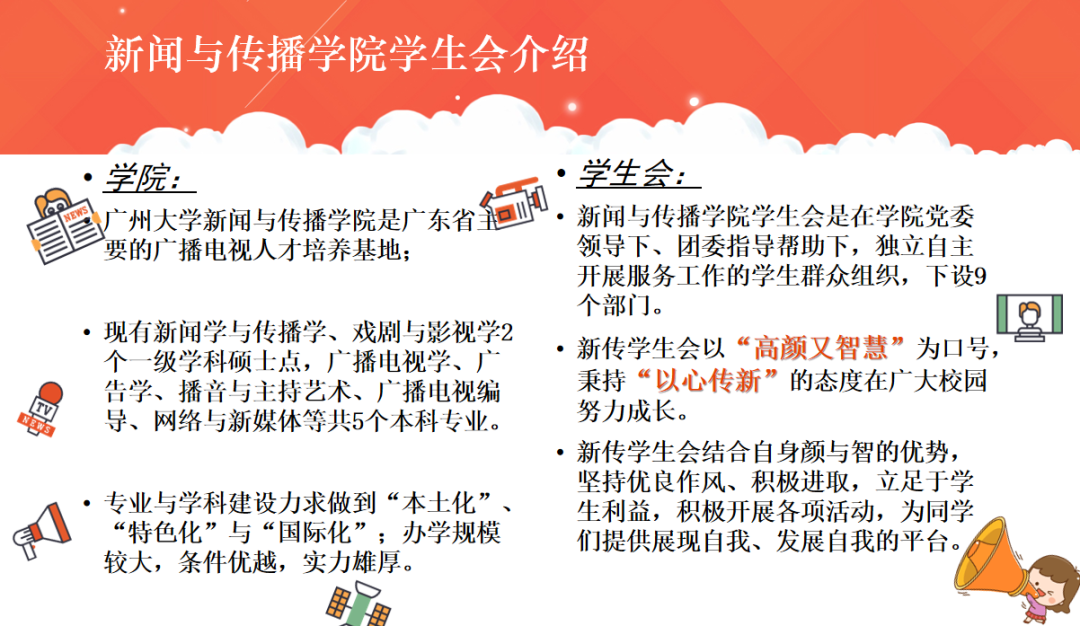 学生会进行工作汇报,分别从“多样活动,多彩发展”、“积极建设,完善组织”、“凝心聚力,共同抗疫”和“以心传新,一同奋进”四个方面展开,对91自拍